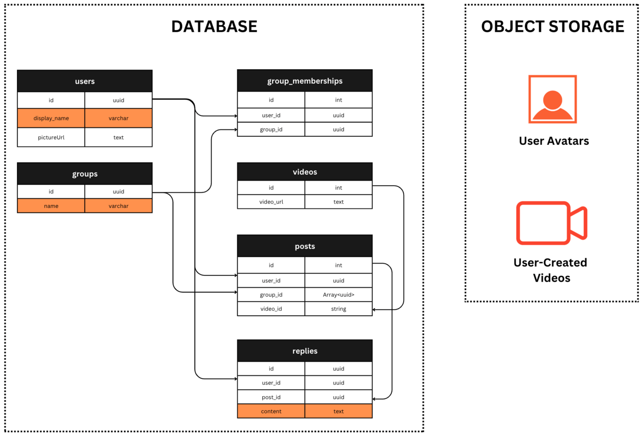 Ours is a video sharing app, where users belong to one or more groups and can cross-post videos to multiple groups if desired.