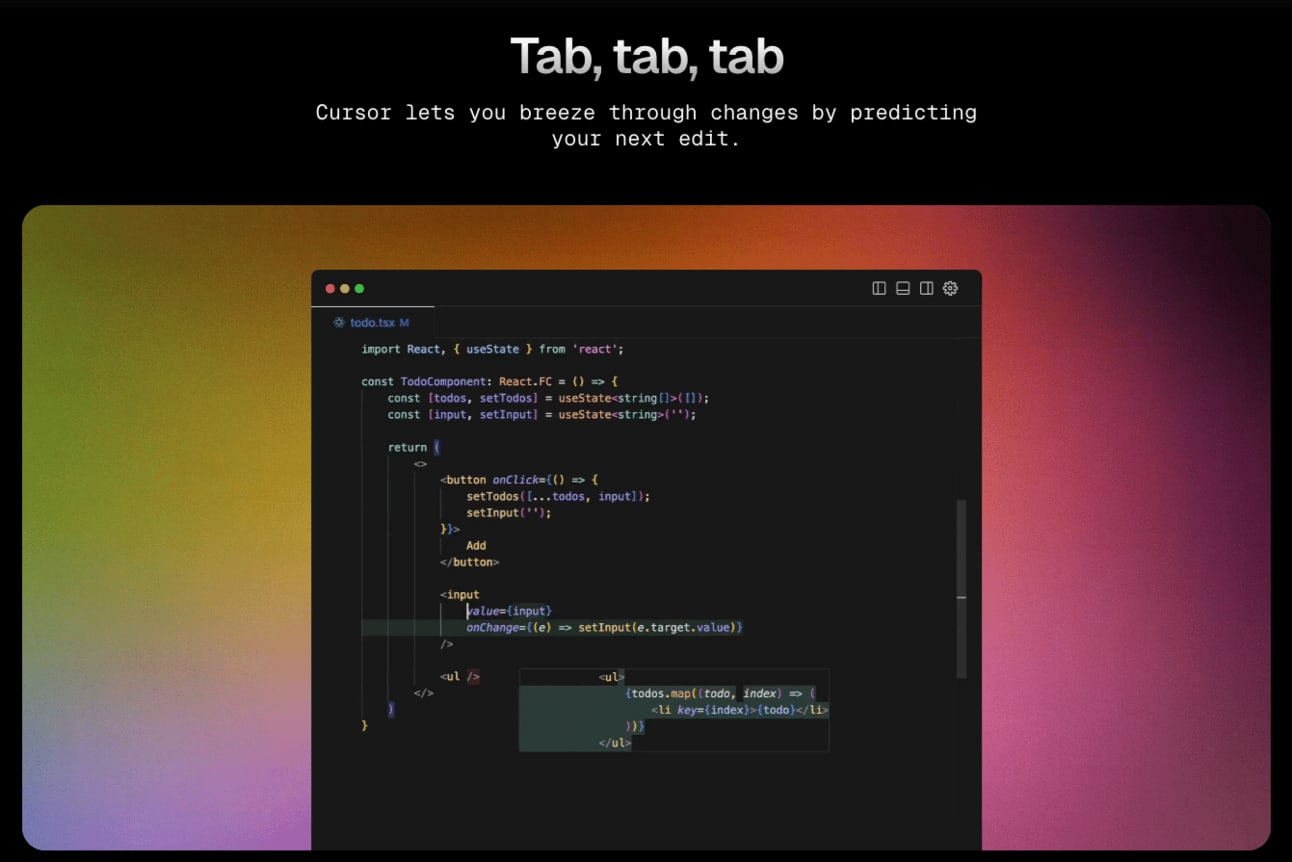 After you’ve written half a line of code, Cursor more-or-less knows what you’re trying to do and offers you a suggestion that you can accept by pressing the tab button.